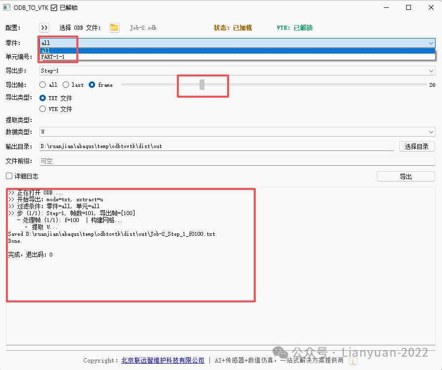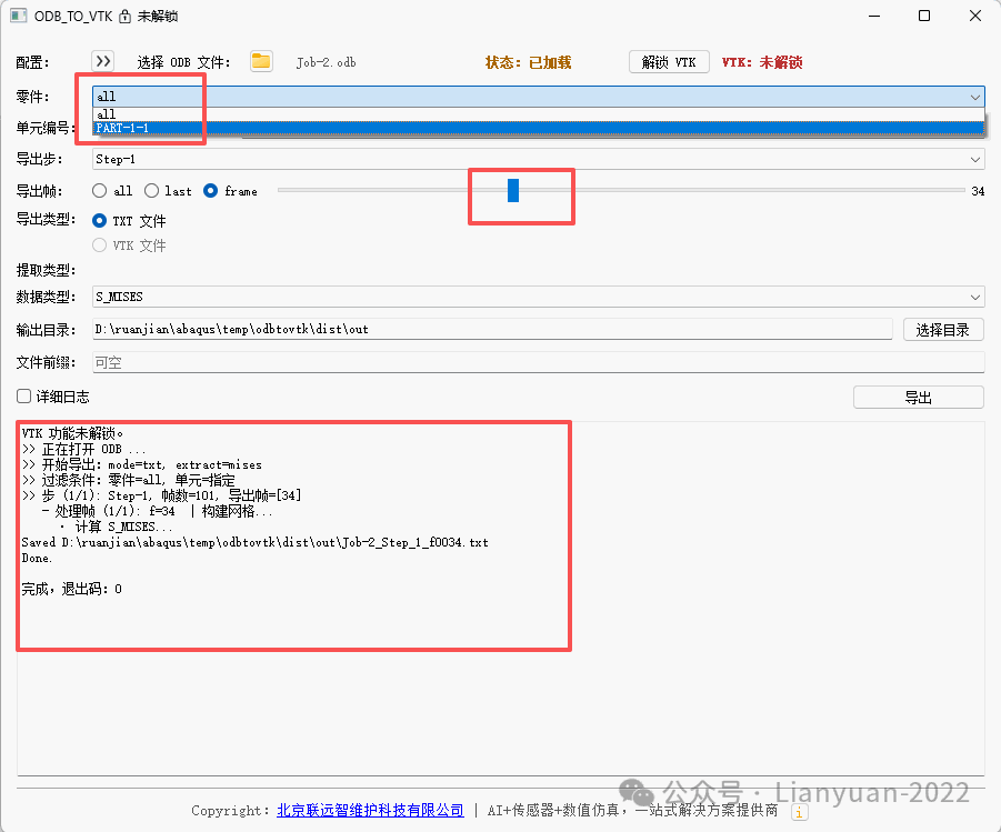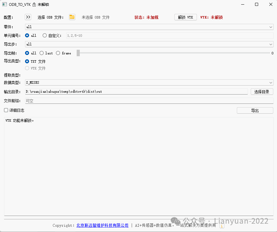功能1:将Abaqus结果转化为TXT文本或VTK文件,通过可视化页面,能够将任意零件、任意载荷步、任意单元编号的Mises应力和位移输出为TXT文本,该部分功能完全免费,有需要的可以直接获取,具体下载链接为: